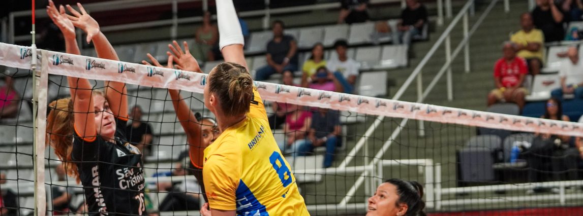 O jogo – Com uma bola de china, Valquíria ignorou o bloqueio da equipe de Brusque para fazer 15/6. Polina atacou no 19/11. No final da parcial, Tiffany entrou em quadra na inversão e cravou no 22/16 e 23/17. Após Luizomar desfazer a mudança, Polina fechou a parcial no contra-ataque, após levantamento de Sophia, 25/18.